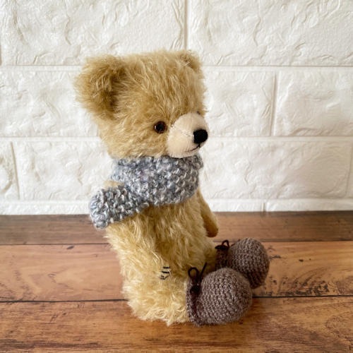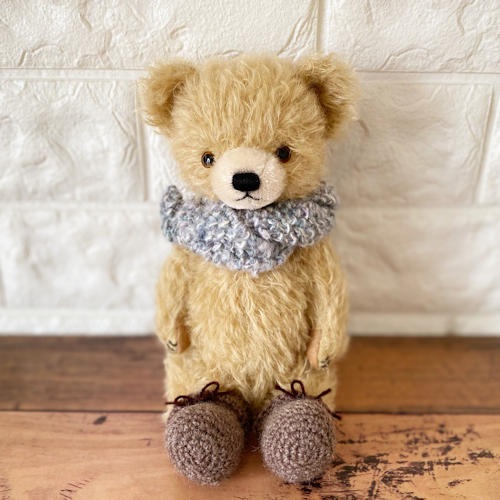 説明:時を経た温かみのあるぬいぐるみのようなイメージで制作しました。切り替えのショートモヘアのマズル、瞳のあるグラスアイ、平たい耳などレトロスタイルのテディベアです。たくさん可愛がっていただいて本物のアンティークべアのように育ってくれたら嬉しいです♪