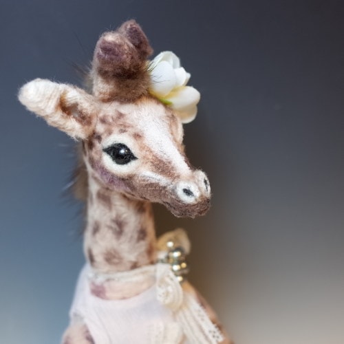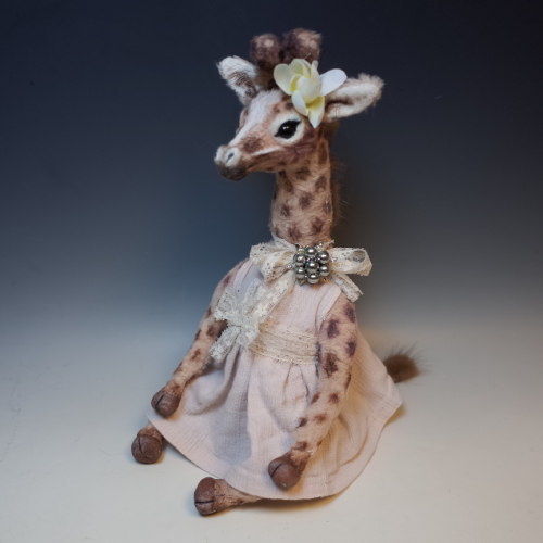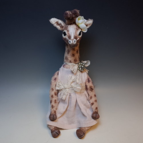 タテガミはミンクの毛で頭に布花、首にはレースのリボンにブローチ、ワンピースを着てる女の子