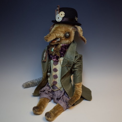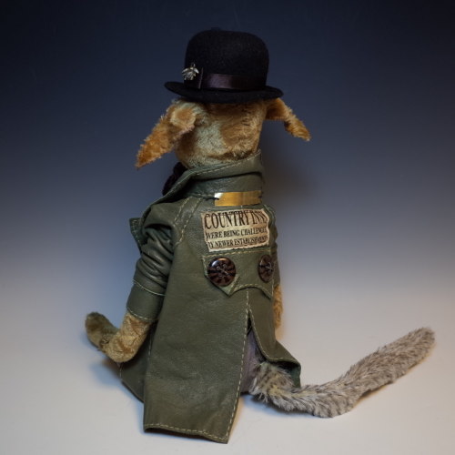 説明:皮のジャケットにパンツ・ベスト、別珍の蝶ネクタイ・アンティークブローチ・フェルトの帽子・チェーン