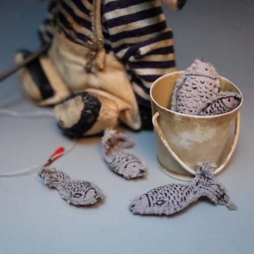 その他:ボーダーTシャツ・コットンパンツ・バケツ・釣竿・魚
