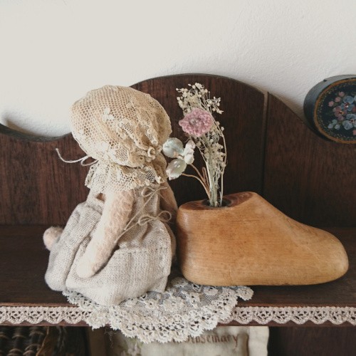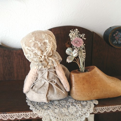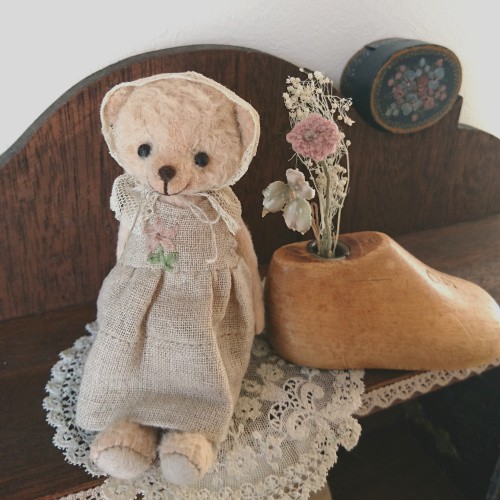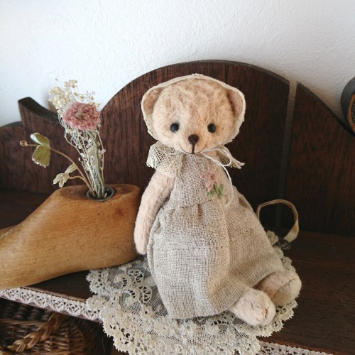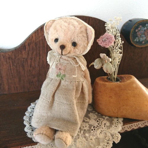 説明:優しいお色のビスコースのくまさんが出来ました。古い古いアンティークレースを使ったボネ、柔らかい手触りのリネンガーゼで作ったワンピースにはワンポイントでピンク色のお花の刺しゅうを施しました。笑顔がとても愛らしくて、手のひらに乗せて目が合うと心がホッとします。小さな可愛い作品になっています。