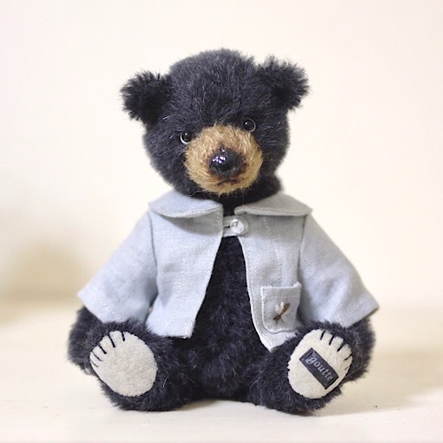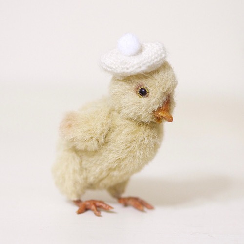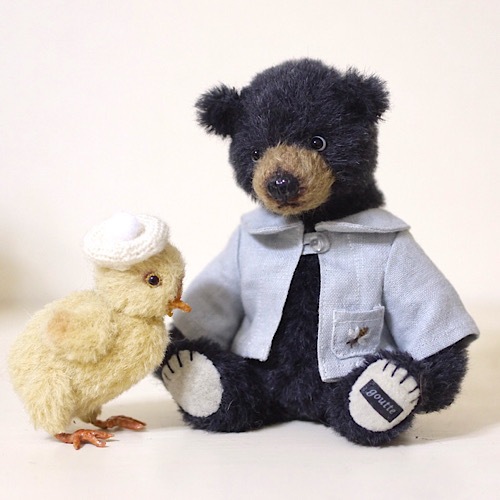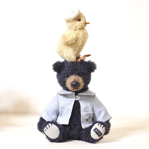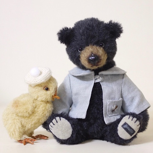 説明:とぼけた表情のクロクマ君と元気いっぱいのヒヨコちゃんです。