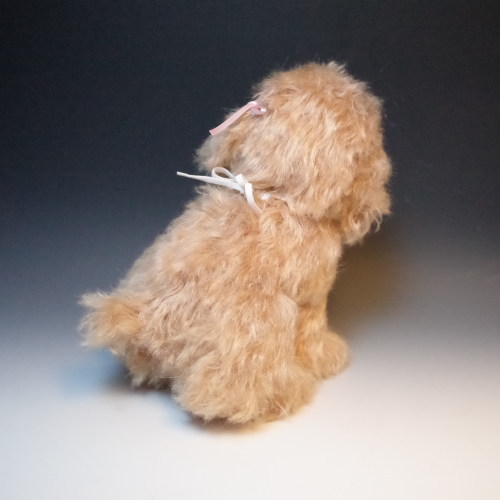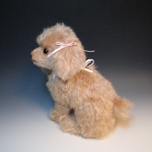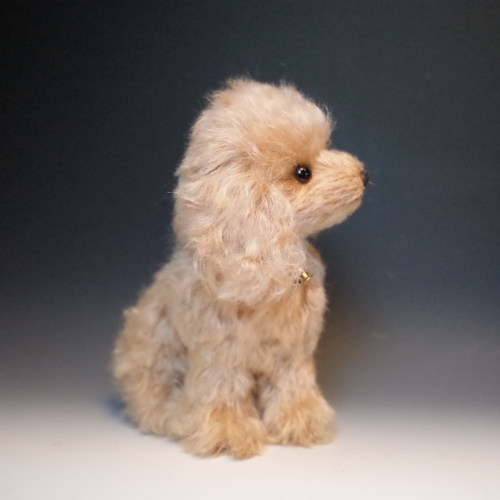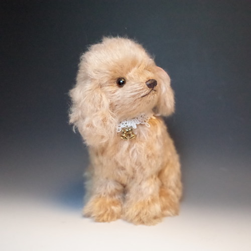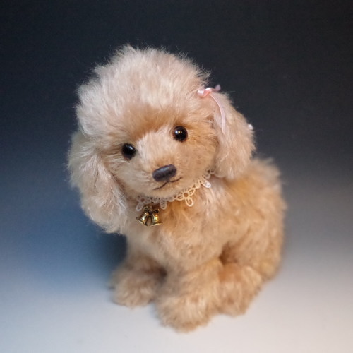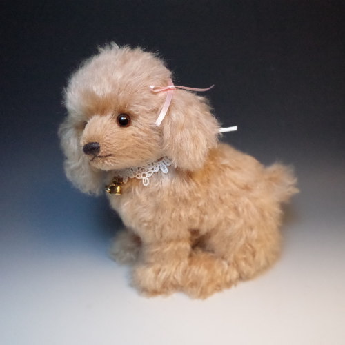 説明:お座りが上手なアプリコット色のトイプードルです。大きなブラウンの目で見つめてきます。首と後足にジョイント、しっぽにテクノロートを入れています。