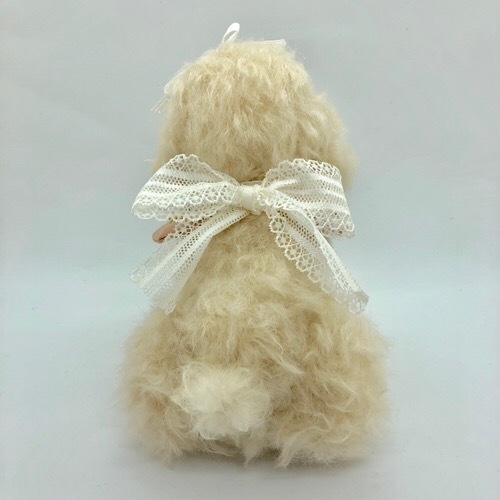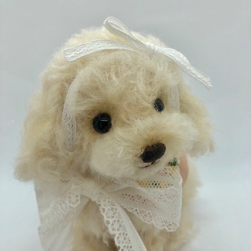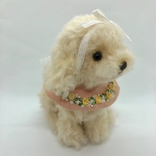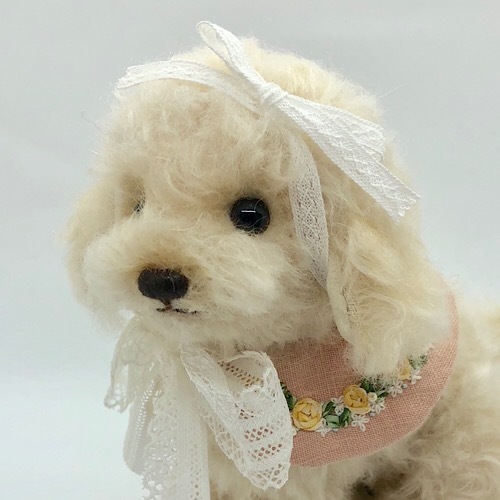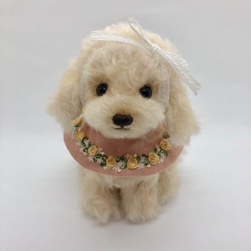 説明:クリーム色のトイ・プードルです。大きなリボンがお気に入り。お利口にお座りして待っています。刺繍入りカラーは前後どちらでもかわいいです。