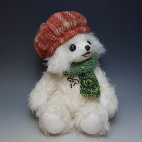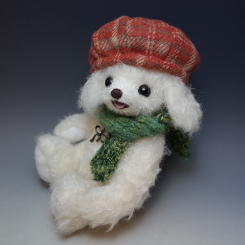 トイプードルです。手編みのマフラーとウール地のベレー帽をかぶっています。帽子は手縫いですが裏地もちゃんとつけてあります。