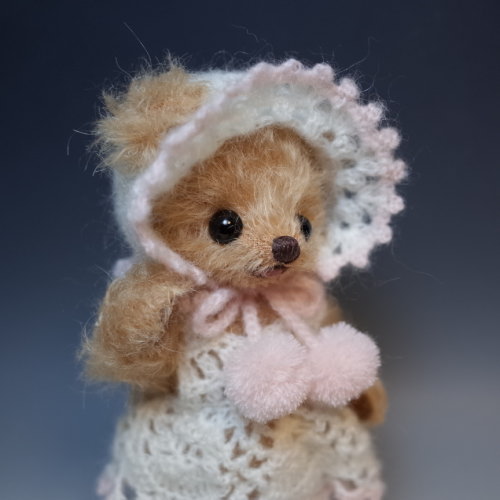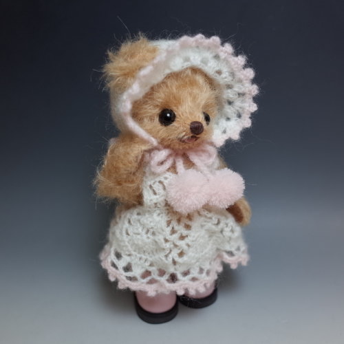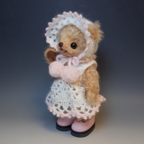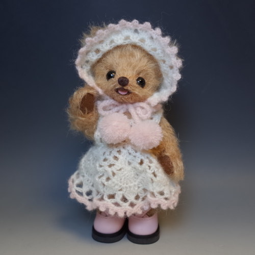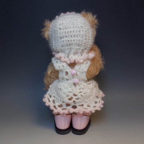 説明:ピンクの靴に合わせてワンピースとボンネットを編みました。靴は既製品です。ボンネットのつばの部分にワイヤーを編みこんでいますので型崩れしませんが、端で怪我などしないようお取扱いにお気を付けください。
