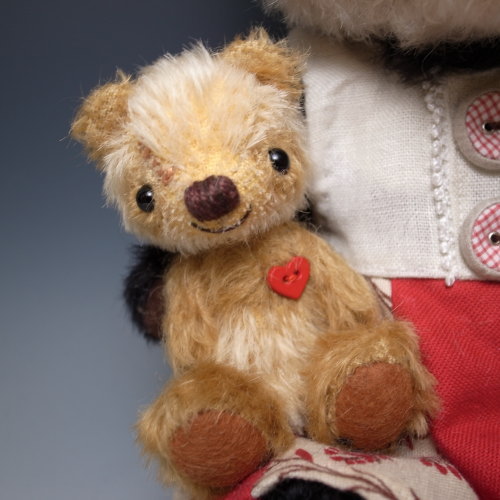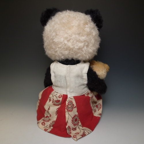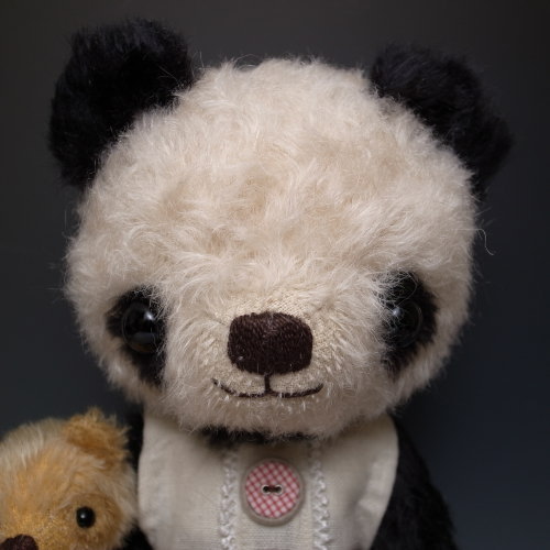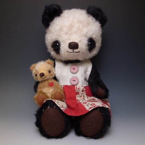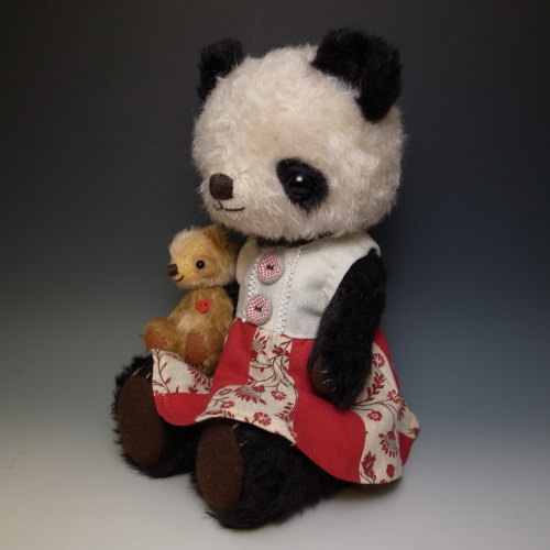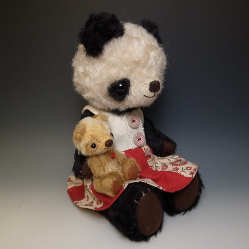 パンダのぬいぐるみのうしろに透明なゴムがついてますので大きな子の腕につけて固定させると抱っこしたまま落ちません。白い部分はシルバーホワイトという色のモヘアを使用。純白ではなく最初からくすんだ感じです。