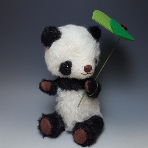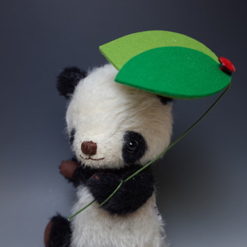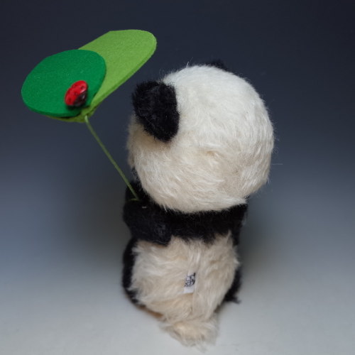説明:「なかなかやまないあめでした~ かさでもかぶっていましょうと~あたまにはっぱをのせました~♪」「あめふりくまのこ」のイメージでパンダを。腕には針金が入っていますので、簡単なポージングができます。はっぱの傘は腕にまきつけて固定してあり、取り外し簡単です。