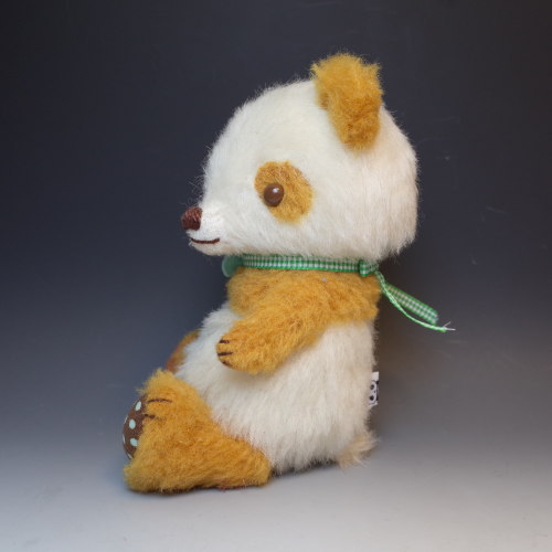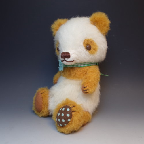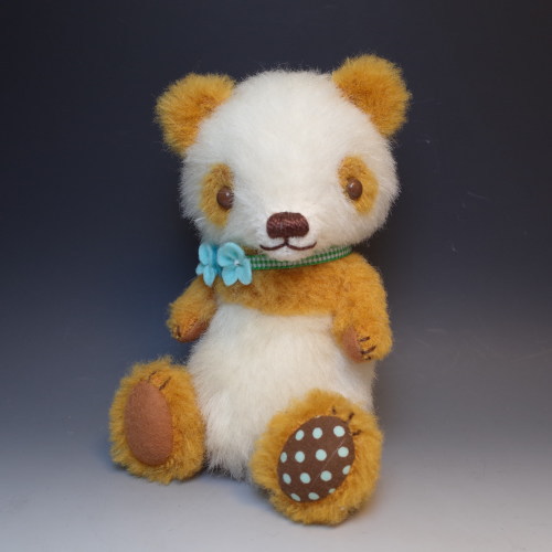 説明:やわらかなイメージで作ったパンダです。首に巻いたリボンは取り外せます。