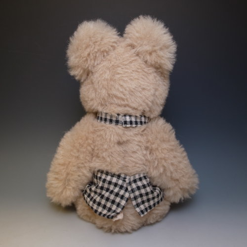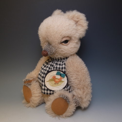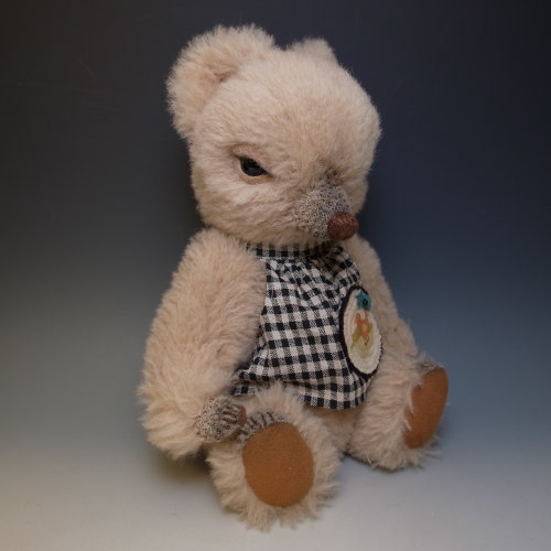鼻面や手・足先の毛を刈り込んで、特徴的な下生地が見えるように作りました。雰囲気のあるベアになったと思います。お洋服はベアに馴染むように紅茶染め等でわざと汚してあります。部分的に、コンテ・その他で彩色を施してあります。