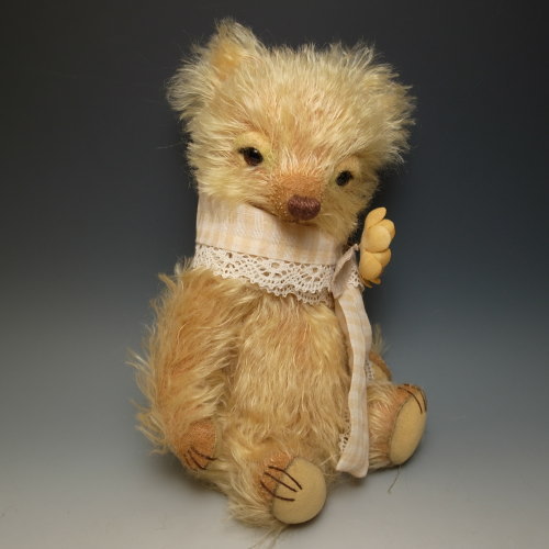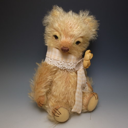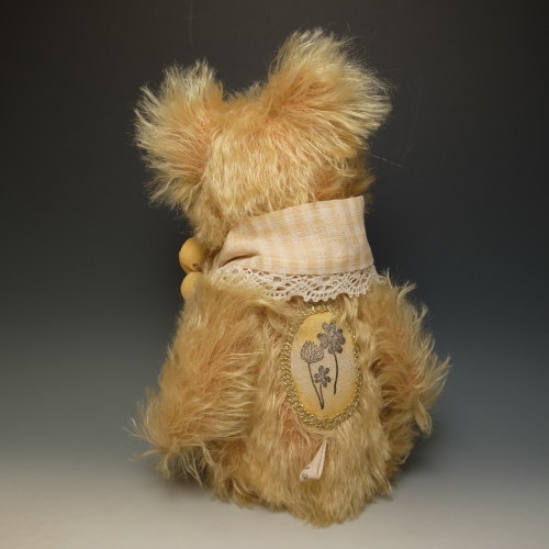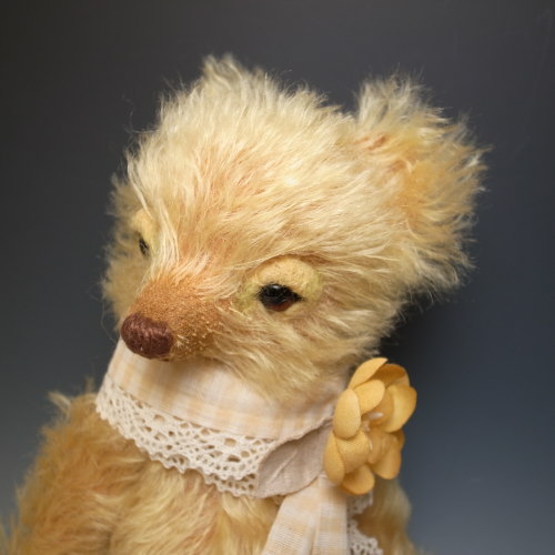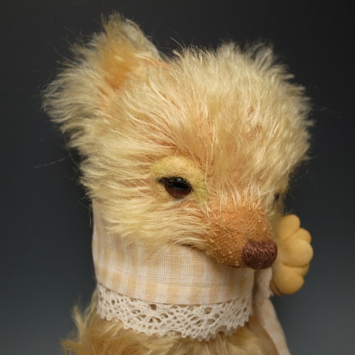 首に巻いたストールと手染めのコサージュは、もちろん着脱可能。背中にはスタンプを押したアップリケを縫いつけました。部分的に彩色を施してあります。
