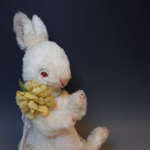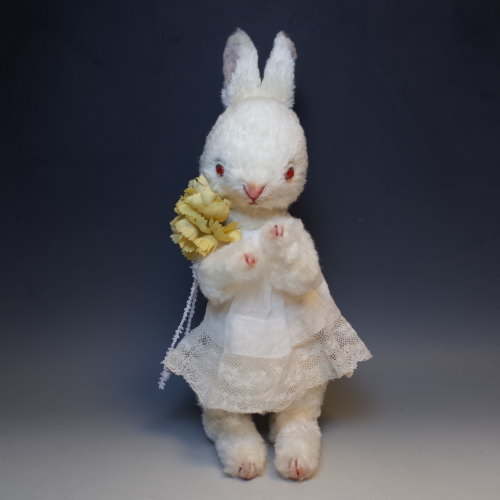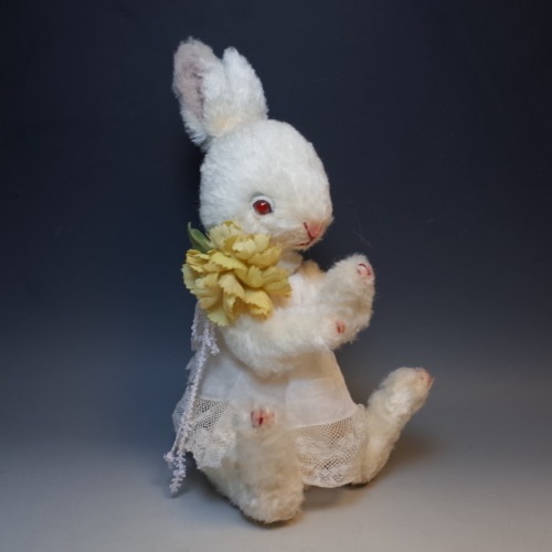 説明:アンティークの布で作った簡単なお洋服を着ています。(着脱可能)コットン製の手染めのお花は、コサージュピンで首元に留めてあります。