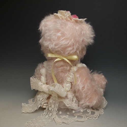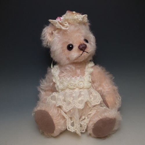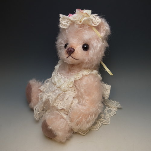 春爛漫、ピンクのモヘアで桜をイメージしたベアです。レースのエプロンドレスで優しく仕上げました。