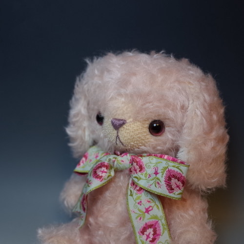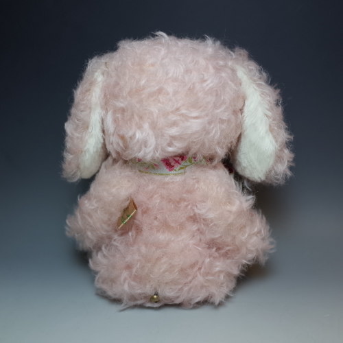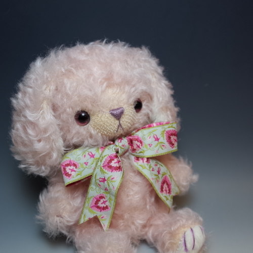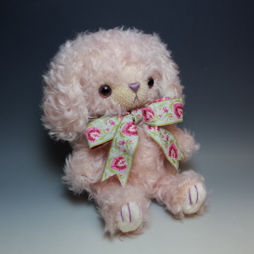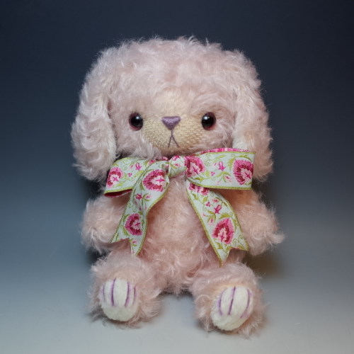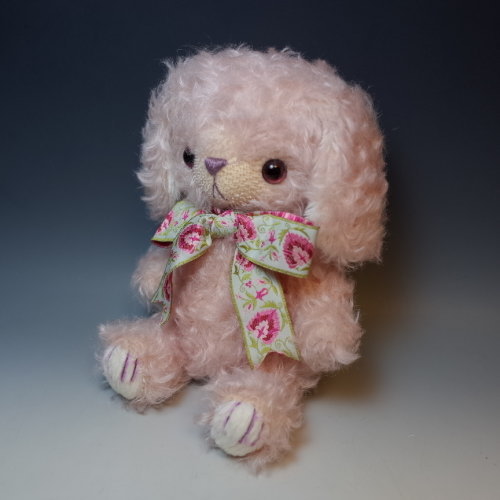 説明:くるくるふわふわのモヘアで作りました。ロップイヤーの内側と足裏は、ふんわりビスコース。大き目で存在感のあるコです。素敵なルネッサンスリボンでおめかし♪