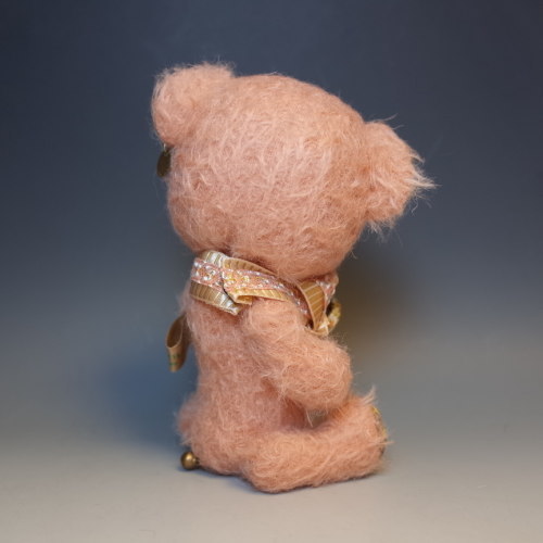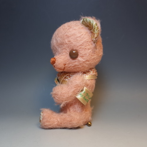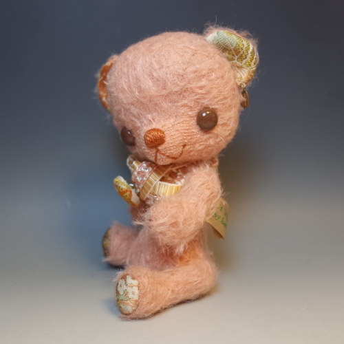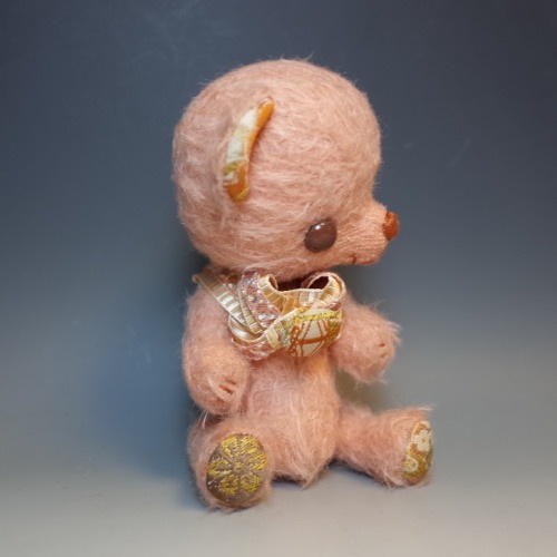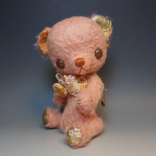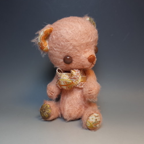 説明:おめめがマーブルチョコみたいなMarbleシリーズのコです。淡いオレンジの綺麗なモヘアに素敵な柄の帯生地を合わせました。凝った造りの首飾りがお気に入り♪一緒にいるとほんわかした気持ちになれるコですよ。