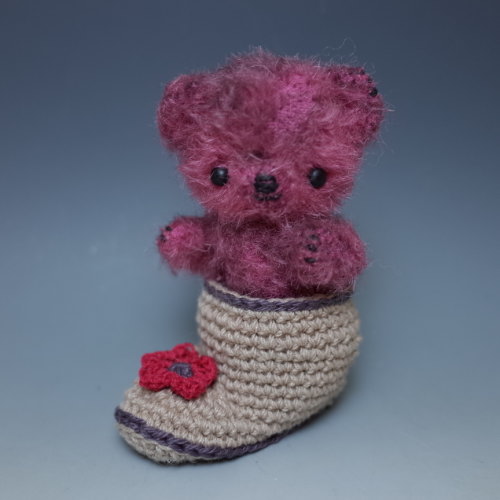 説明:綺麗なピンク色のモヘアのくまさんです。手編みの長靴に入っています。