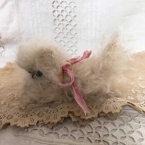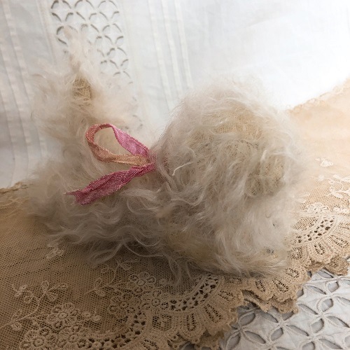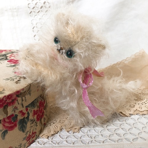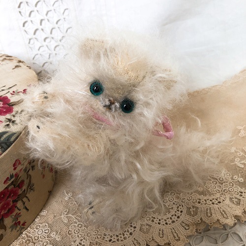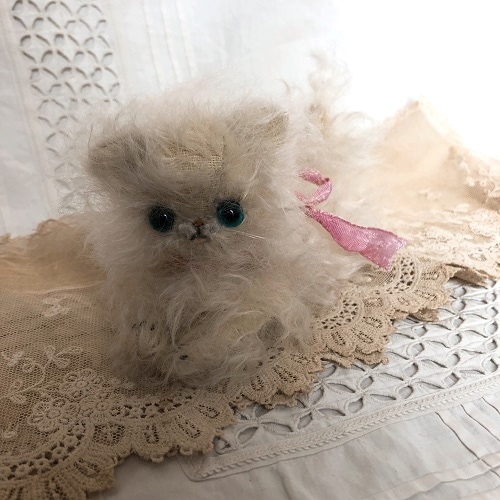説明:リボンを付けたオフホワイト色の猫さんです。ボディーはとても柔らかく抱き心地がいいです。グリーン色のグラスアイを使用しています。