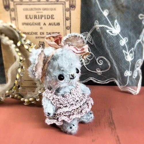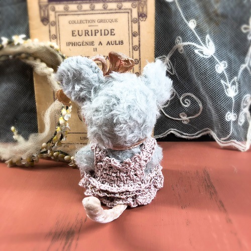 説明: 淡いグレー色をしたねずみさんです。ワンピースとおリボンを付けています。