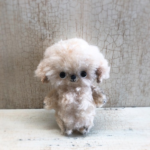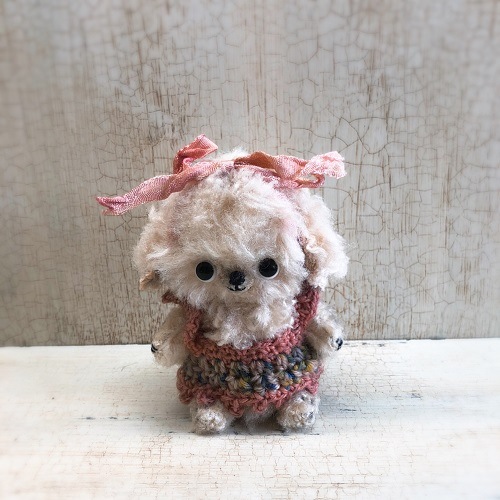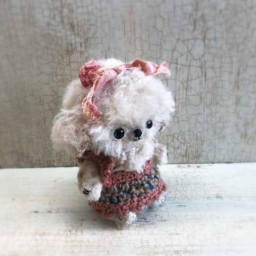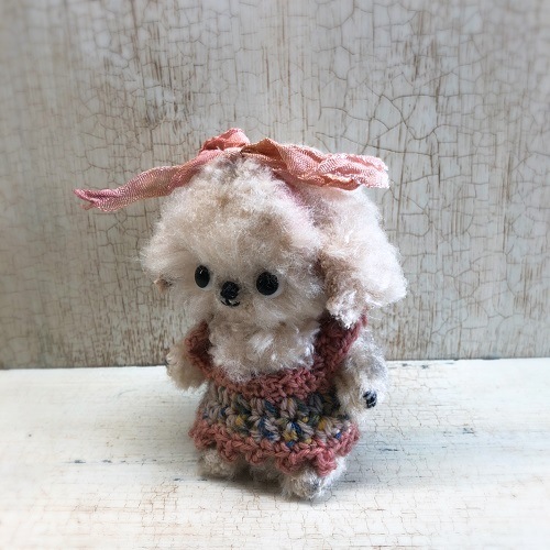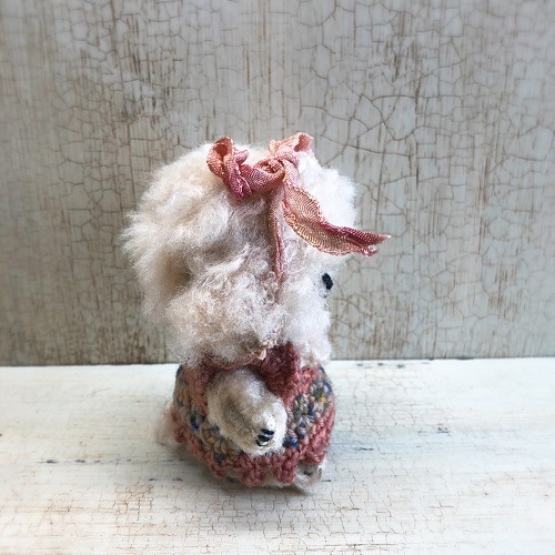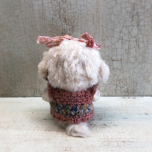 説明:オフホワイトの犬さんです。ワンピースとリボンを付けています。アンティーク風にペイントしています。