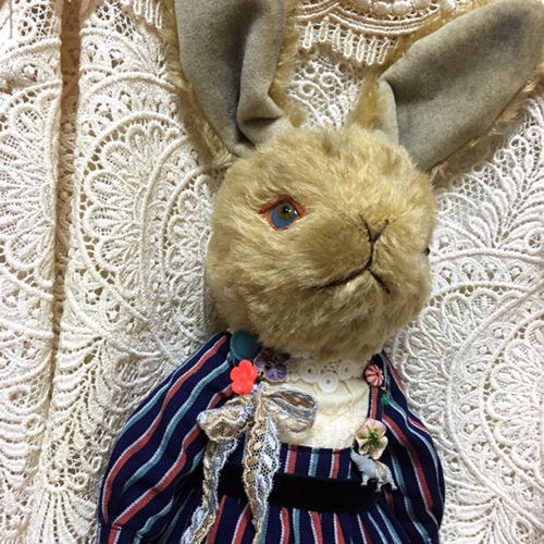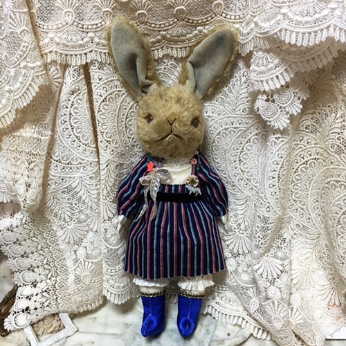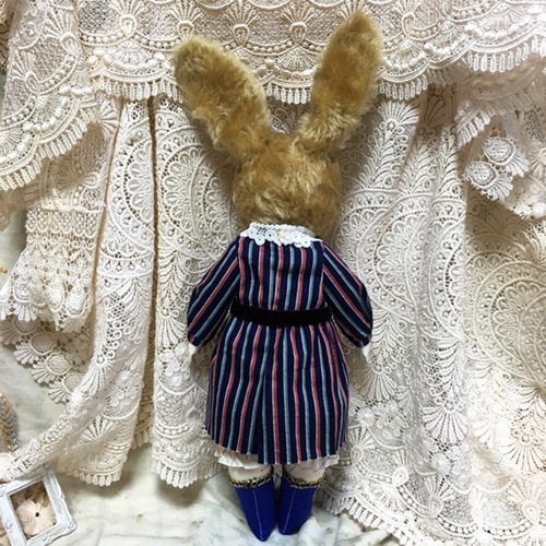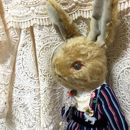 説明:顔はモヘアのうさぎで身体は綿で人間の形をしています。可愛い洋服を着せてあげたかったのでこうなりました。どうぞよろしくお願いいたします。