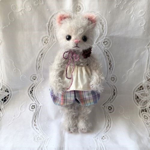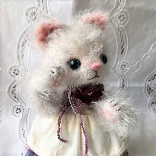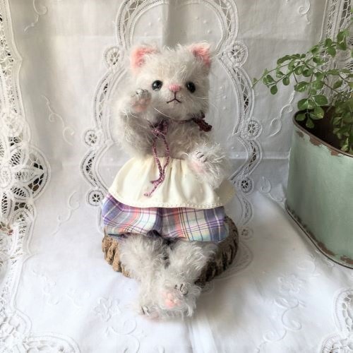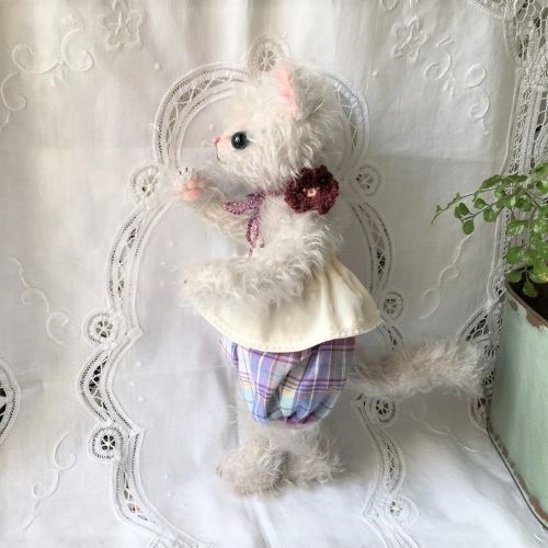 説明:お洋服は着脱可能。ねこさんなので、とても柔らかく仕上げており、手足・しっぽにもワイヤー・ジョイントが入って色々なポーズを楽しめます。