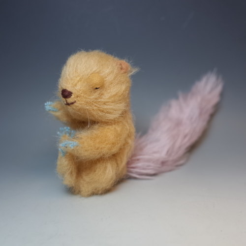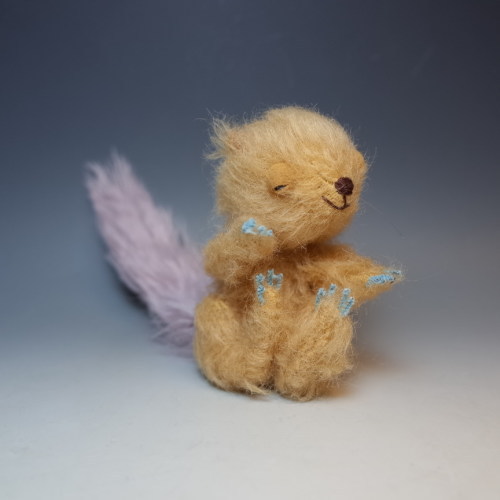 説明:チャッピー(リス)が丸まって寝ている様子です。尻尾を枕に丸めて遊んで下さい。尻尾にモール入り。可動。