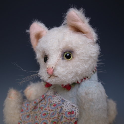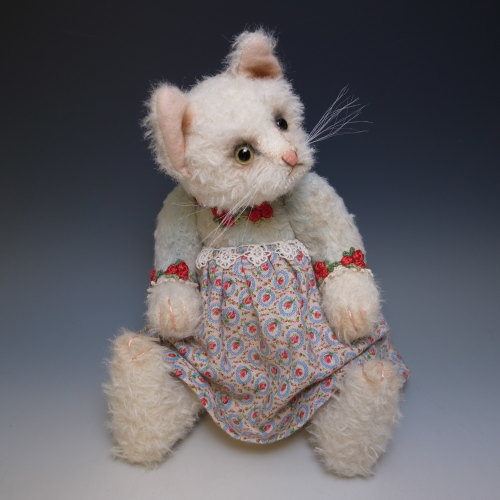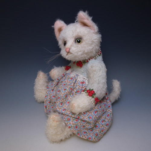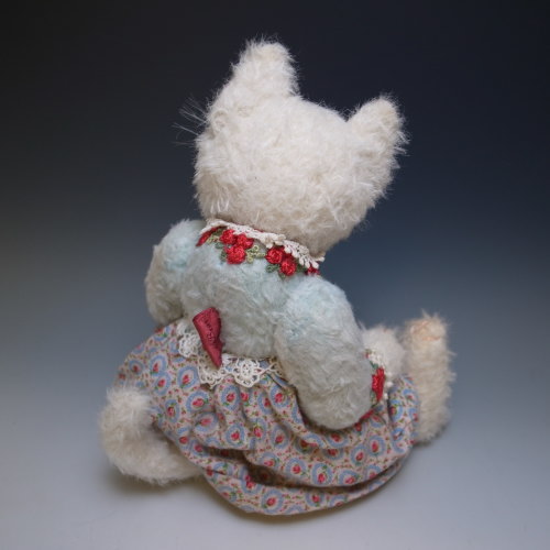 手染めのビスコースとフィードサックで洋服を作りました。洋服は切り替えになっているので脱がせられません。尻尾にはワイヤーが入っていて曲げられます。