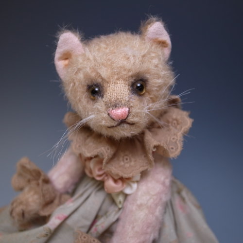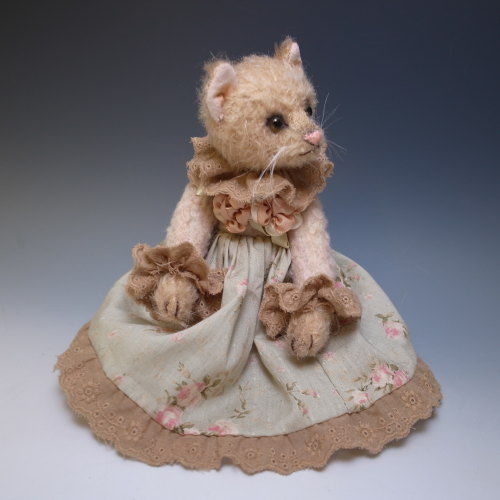 手染めのビスコースとプリント生地で洋服を作りました。洋服は切り替えになっているので脱がせられません。尻尾にはワイヤーが入っていて曲げられます。