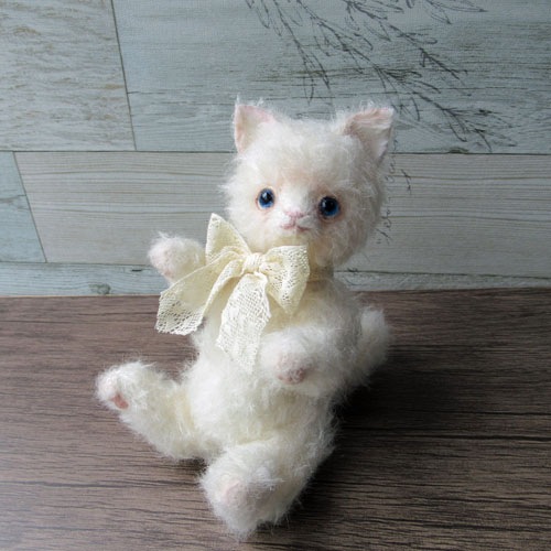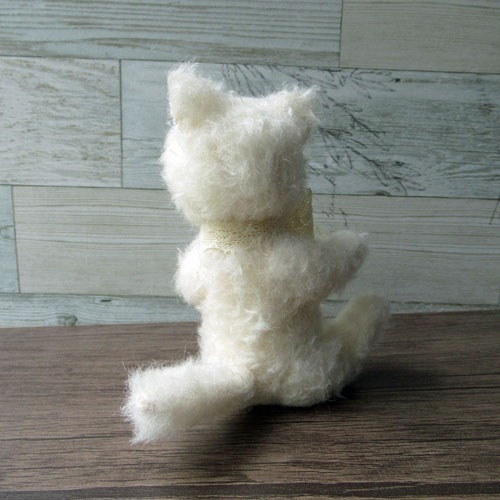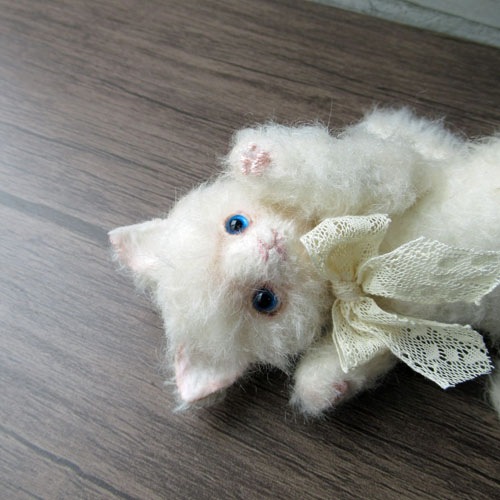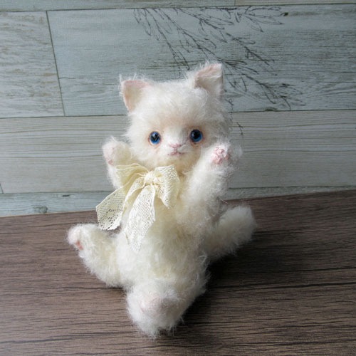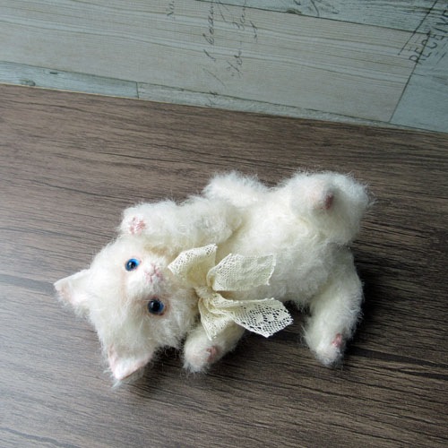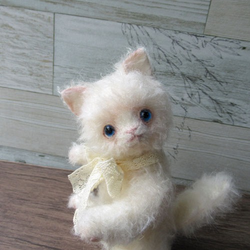 説明:小さい白い猫。手足の肉球は刺繍です。お顔に植毛をしております。ブラッシング等お気を付け下さい。