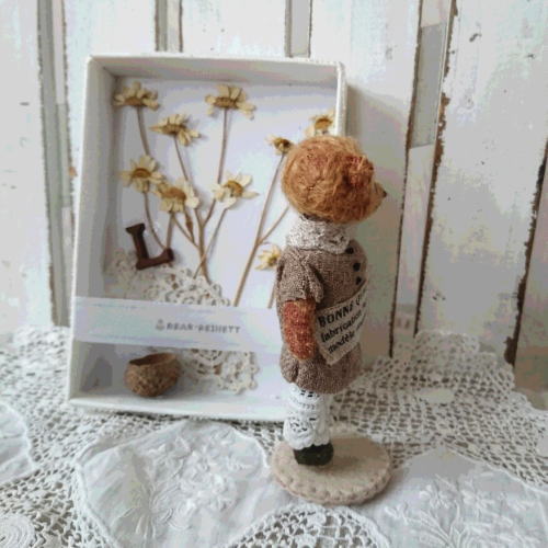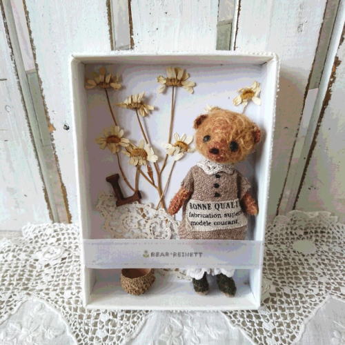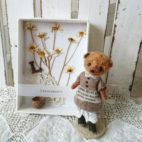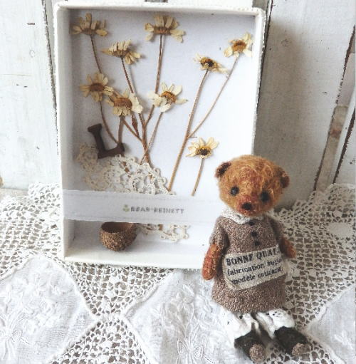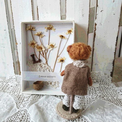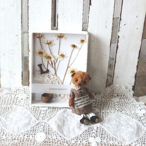説明:今回の作品はたくさんの想いのつまったものになりました。いつでもどこでもどんな時でも・・・手に取って下さる方の胸ポケットにもそっと入るくらいのサイズの作品です。静かに見つめてくれる小さな小さなベアを作りました。そんなベアを手作りのギフトボックスに入れました。ドライフラワー、アンティークレース、名前のルッカの頭文字の『L』の木の文字、どんぐりの頭、楽しいデコレーションのギフトボックスです!