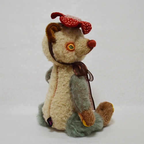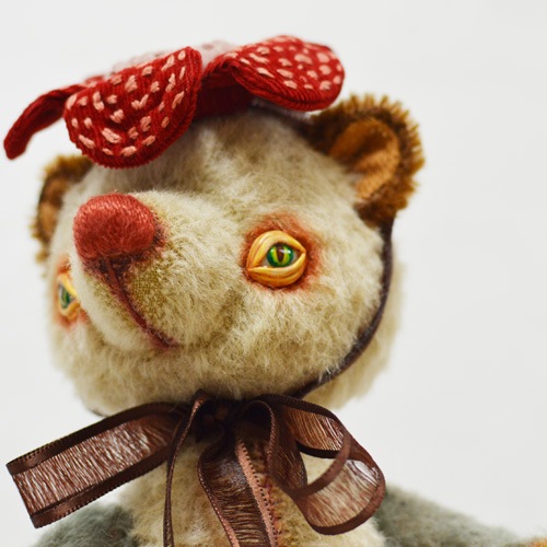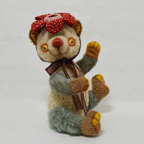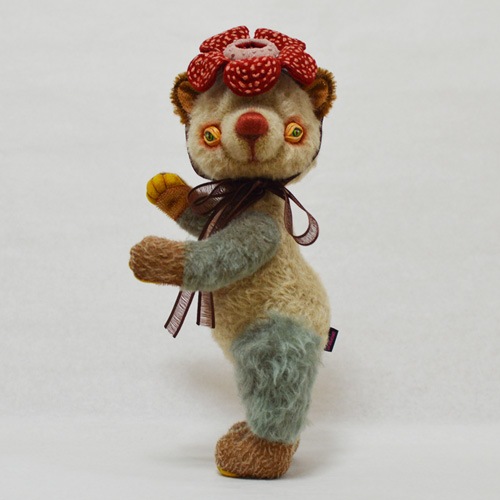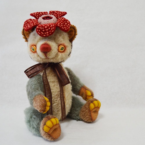 説明:頭にラフレシアでおめかしをした愛嬌たっぷりなベア。ラフレシアはブローチになっているので着脱可能になっています。花びらにはワイヤーが入っているので、多少ですが形を変える事が可能です。花びらの模様などは全て刺繍になっています。