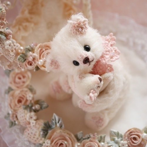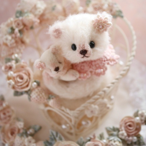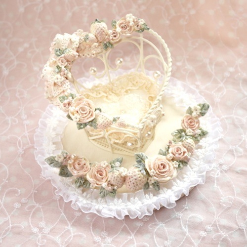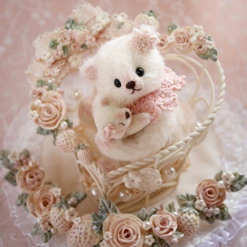 説明:ハート型のベースに樹脂粘土で作ったバラと苺を施しました。腕にはワイヤーが入ってるのでポーズを変える事が可能です。小さなくまちゃんの手足とネックも動きます。