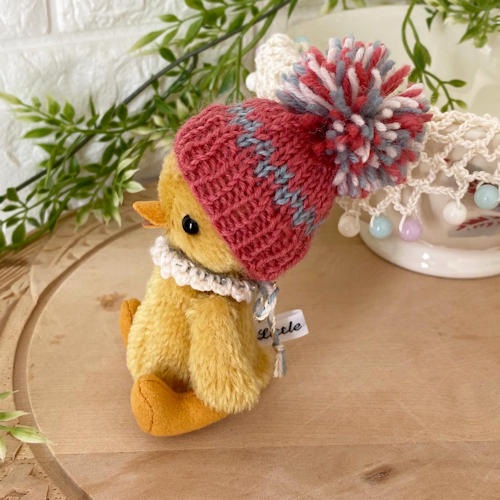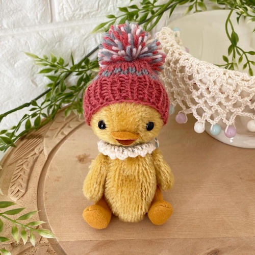説明:かわいい黄色のショートモヘアを使用し、ビンテージ感のあるぬいぐるみをイメージしました。手のひらサイズの可愛いアヒルちゃんです。