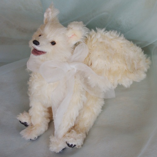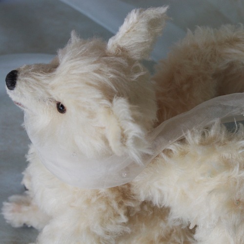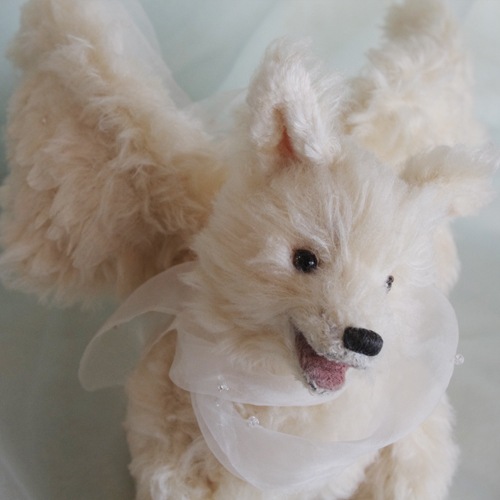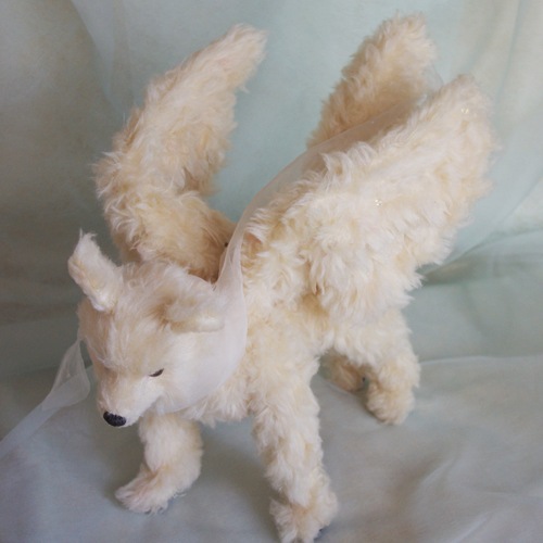 説明:オルゴール入りのシルクのオオカミ天使さん。翼をもらった時に牙はキラキラお空に消えました。そして翼には、スワロフスキービーズがキラキラ煌めきます。オルゴールの音色と共にゆっくりと微笑みながら首を回します。お腹の中にはヒマラヤンクオーツが入っているので、空間の浄化や天然石を元気にしてくれたりします。手足にはワイヤーが入っています。背中から尻尾にはトイスケルトンが入っています。バランスをとれば四つ足で立つことも可能ですか、倒れやすいです。通常は座らせてください。※オルゴールなど繊細な作りとなっています。観賞用として音色と共にお楽しみください。