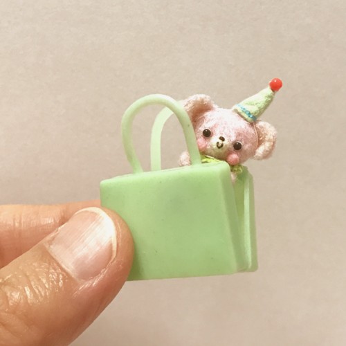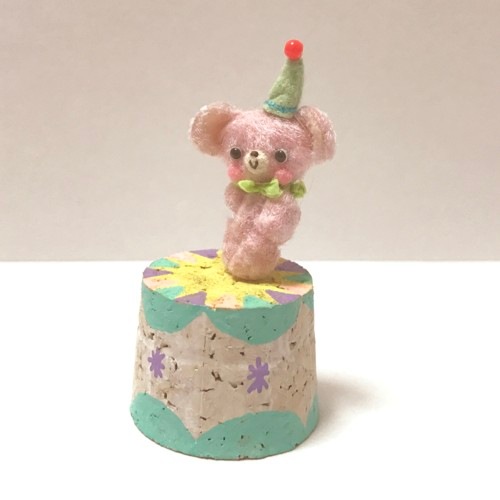 説明:夢かわいい感じの色合いでふわっとかわいい印象に仕上げました。サーカスのイメージで瓶のふたのコルク栓を手書きで色付けしました。ミニチュアベアはコルクの裏からシルクピンで固定してあります。外す際けがなどなさらないようくれぐれもお気をつけください。※コルク栓以外の小物は付属品ではありません。