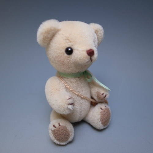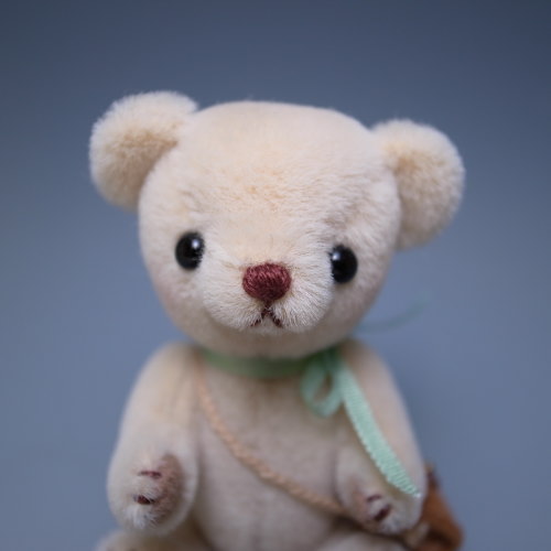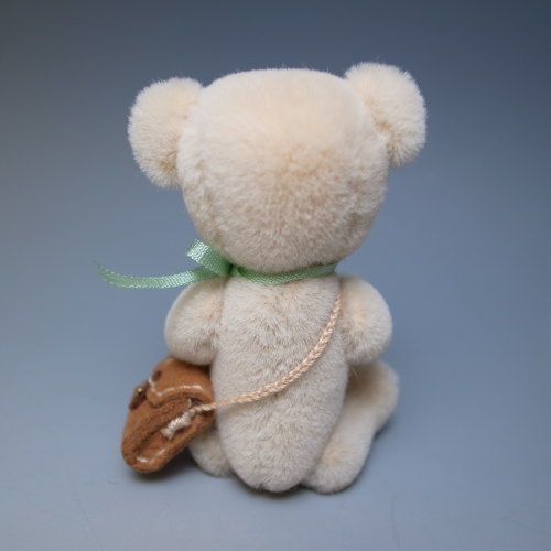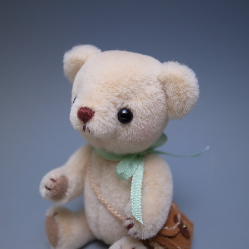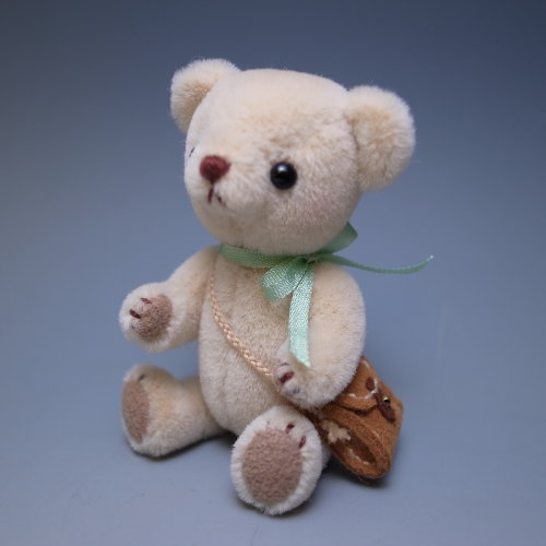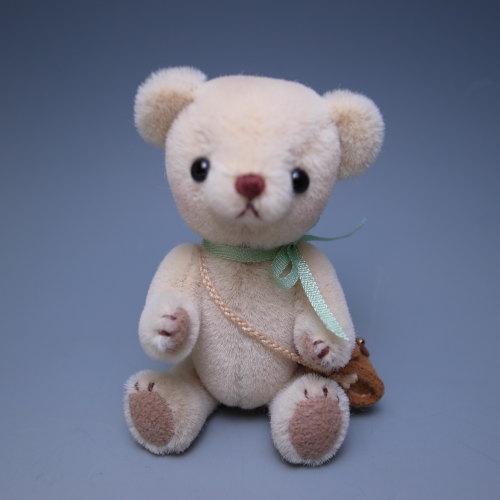 頬は、ほんのり色付けしています。ウルトラスエードで作ったポシェットがお気に入りです。