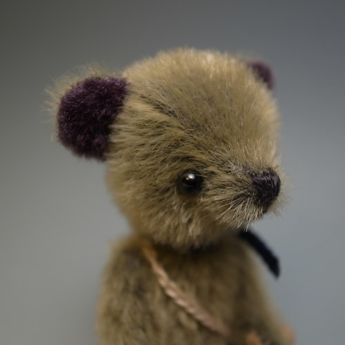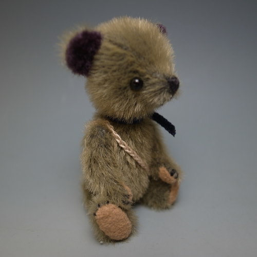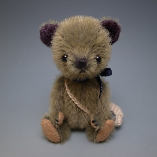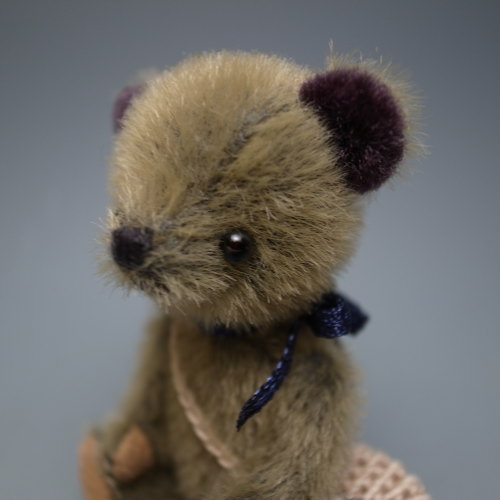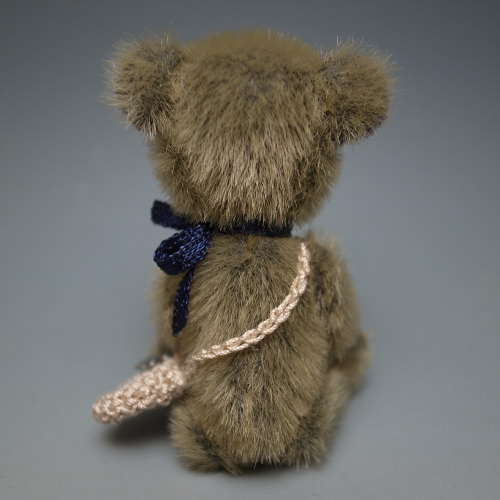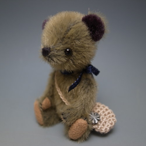 モスグリーンの小さなベア。 手編みのポシェットを提げています。