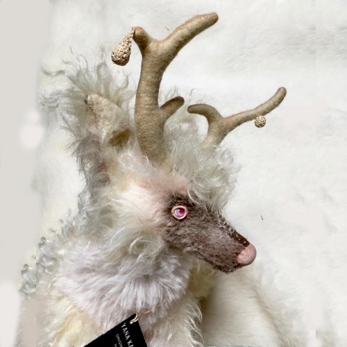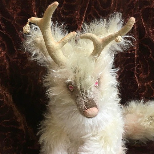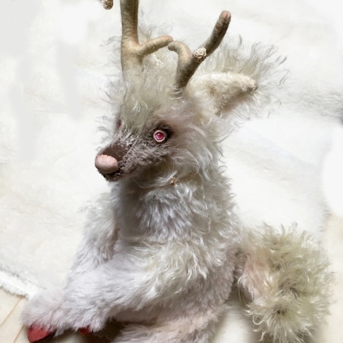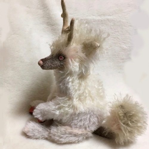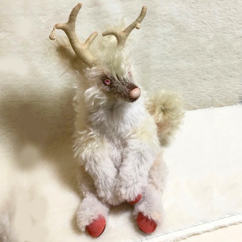 説明:森の奥深くに住むキリンの仔をイメージして作りました。20周年のお祝いにどんな子を送ろうかと思っていたこの夏は異変という言葉が何回も聞こえる夏でした。キリンは平安な世に現れる霊獣だそうです。この子が立派な成獣になり、穏やかで幸せな世界に、そして30周年40周年と益々ベアたちが愛され続ければいいななどと空想しながら作りました。