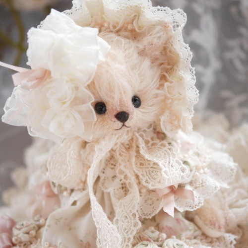 説明:レースをたっぷり使用したロマンティックな雰囲気のドレスべアです。ボンネット、ドレス、ケープ、ドロワーズのセット。着脱可。腕はワイヤー入りですのでポーズが変えられます。