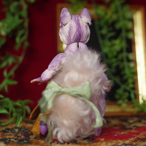 説明:ドングリの実の管理をしている紫色のリスさんです。みんな、冬眠の準備はできてる??大きなバッグに集めては、みんなに行き届くように一生懸命管理します。首や手足はもちろん、耳まで動く球体関節のサーニットボディと、ふわふわのモヘアを組み合わせたドールです。耳や手が動かせることでポーズや表情の幅がとても豊かです。