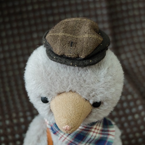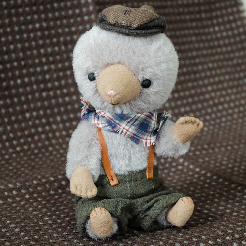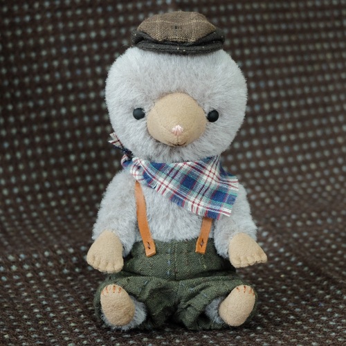 説明:おしゃれ好きなモグラの男の子です。ハンチングは固定。スカーフと吊りズボンは着脱可能。自立はしません。
