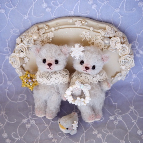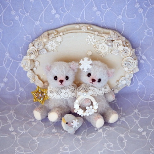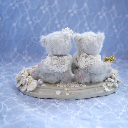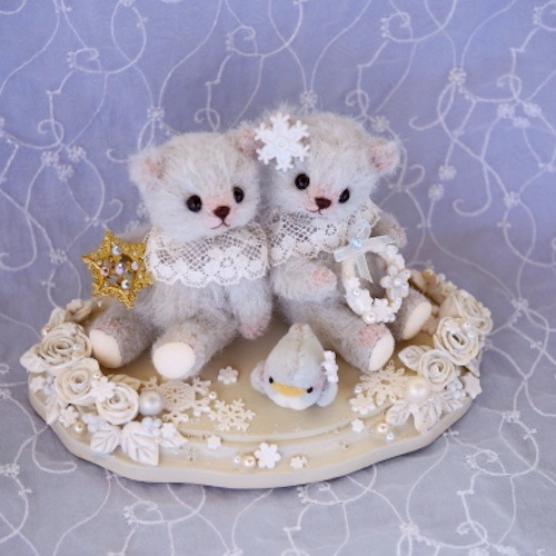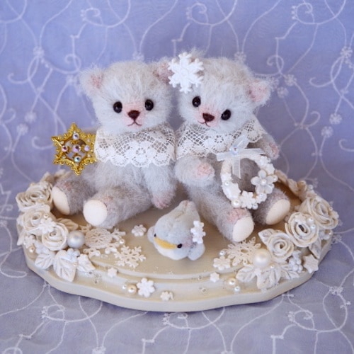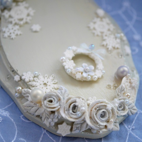 説明:ボディーのお色はブルーグレイ。台座には樹脂粘土で作ったバラやスノーフレークを散りばめました。
