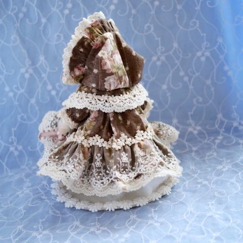 ボンネット、ドレス、ケープ、ドロワーズのセット。着脱可です。