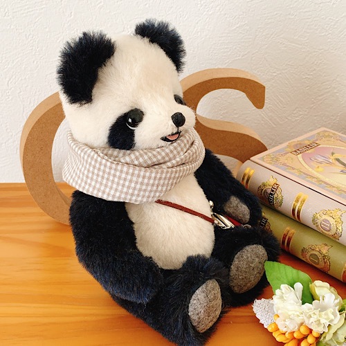 説明:春用スヌードとがま口バッグでお出掛け準備万端のパンダさんです。密度の高いシュルテ社のアルパカ使用で、手触り最高の子です。ポンチ目なのでちょっといたずらっ子ぽい表情です。