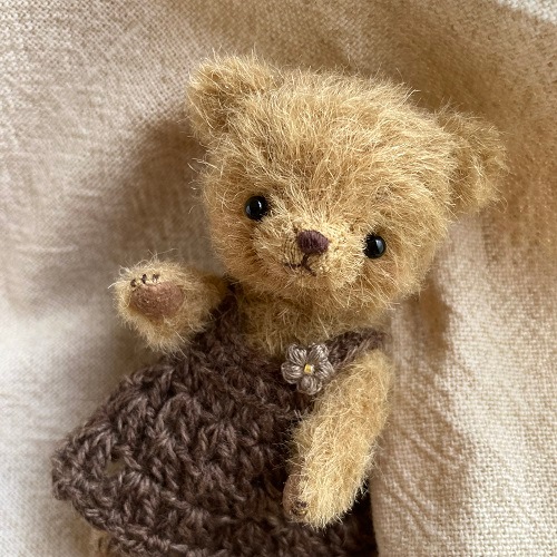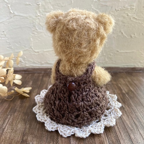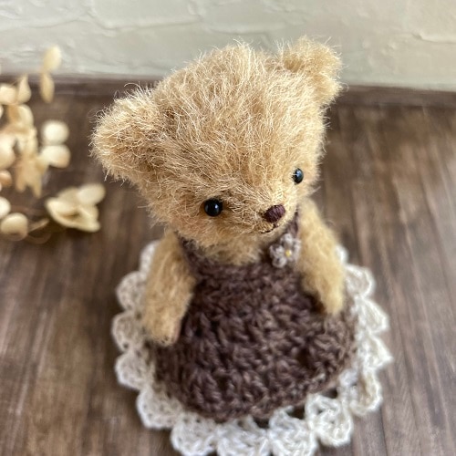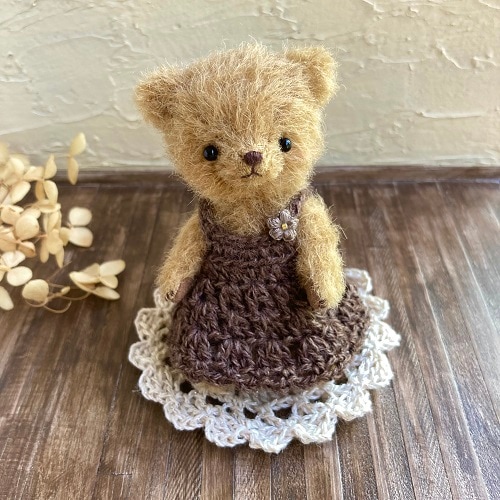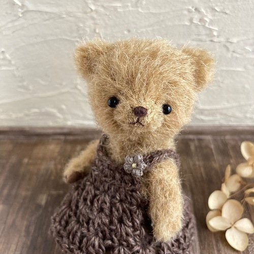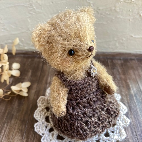 説明:穏やかで優しい表情のくまさんになりました。コットンウールの毛糸でワンピースを編みました。