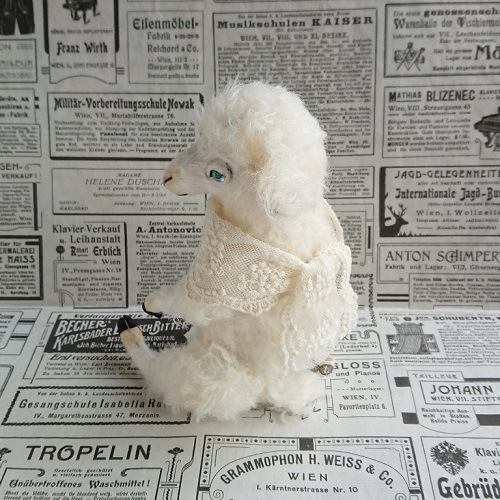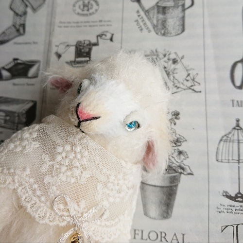 説明:襟飾りにはレース生地を巻いてあげました。本体は部分的に紅茶染め等で着色しています。