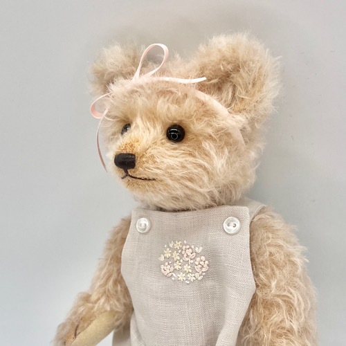 説明:ナチュラルなオーバーオールを着たテディベアです。