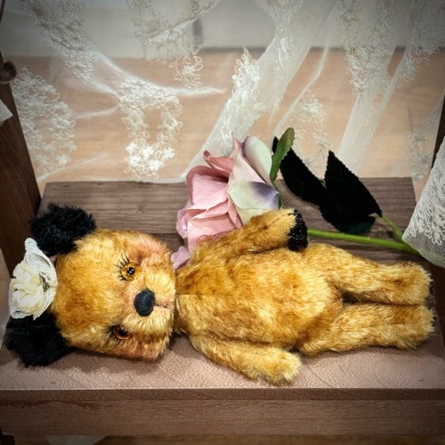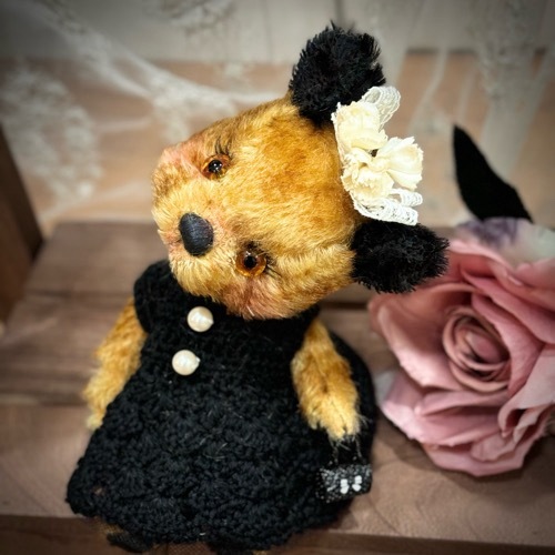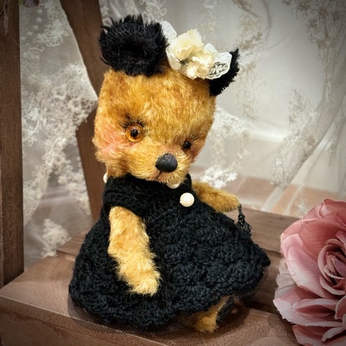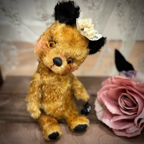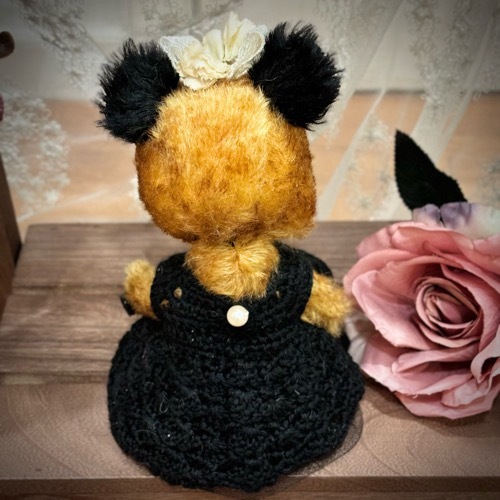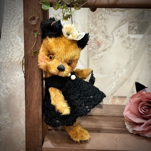 説明:ゴールド系のチップドモヘアに黒耳のベアです。